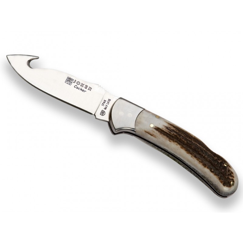 Cocker NC50 skinning hunting knife manufactured by Joker in Albacete. 9 cm blade made of MoVa 1.4116 stainless steel, with lockback blade lock and skinning slot. With deer horn handle and a total weight of 135 g.
