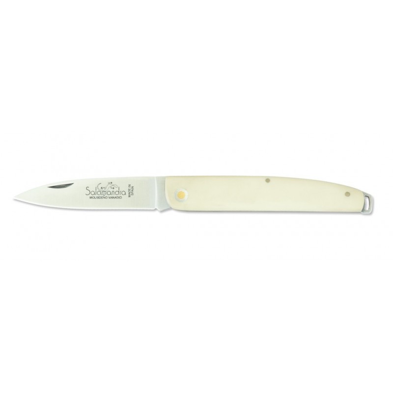 Salamandra 106251 Pocket Knife Handle White JUMA, manufactures handmade in Spain (Albacete), Stainsless Steel Molybdenum Vanadio. Handle with stainless steel liners and Juma (the Juma is a material consists mixture of different mineral-based composite materials with a resin component).