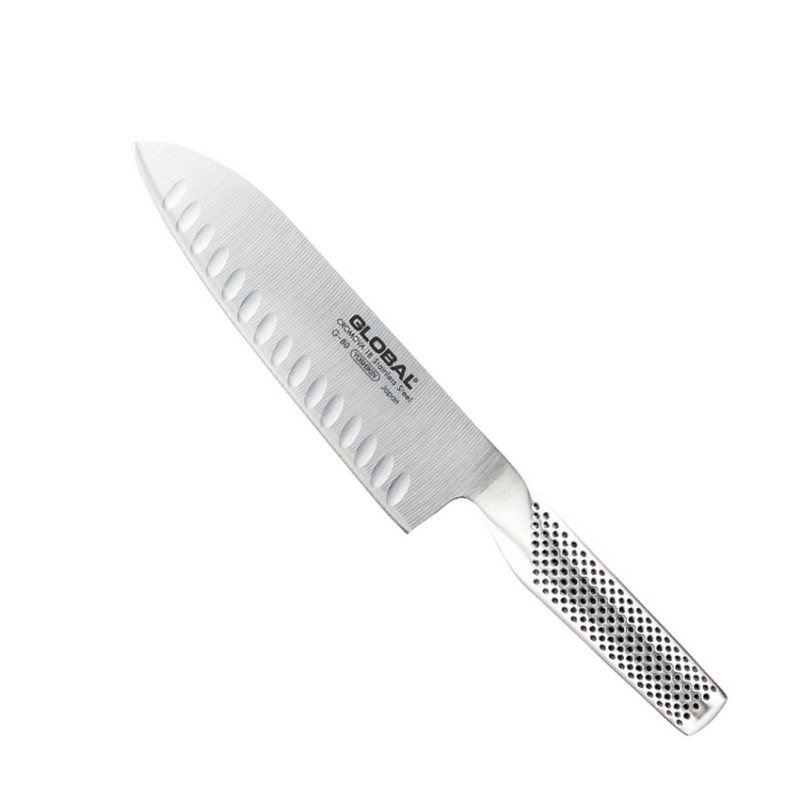 The Global G-80 18cm Fluted Santoku Knife has a fluted blade which reduces sticking to the blade when preparing wet foods, such as fish. It is suitable for all food prep .The G Series Global is a classic collection of larger knives for general preparation with hollow weighted handles.