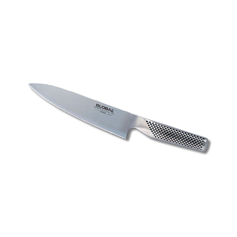 This Global G-55 Chef knife features the same keen edge as all other Global products for perfect slices every time. Its lightweight handle provides a comfortable place to pinch the blade between your thumb and forefinger. It also won't slip out of your hand because the handle has slight indentations that feel coarse and improve your grip. This Global slicing knife helps you to effortlessly carve through any food because of its narrow cutting angle. A Global G-55 chef knife suited primarily for cutting meat block into pieces, it can also be used as a multi-purpose knife for foods such as great for roasts, hams and similar dense foods.