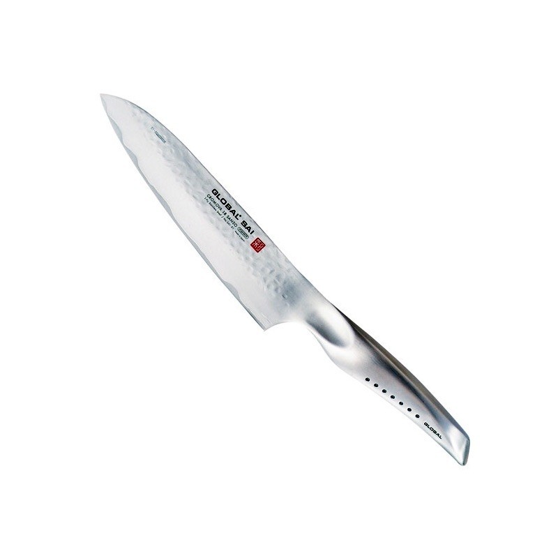 Global SAI01 chef Knife 19 cm blade. Manufactured in 3 layers, this allows obtaining a sharper blade since it is made with 2 different types of steel and the maximum performance is obtained from each type of steel. The blade has a hammered finish known in Japan as Tsuchime, it is not only aesthetic, it also provides better blade slip when cutting.