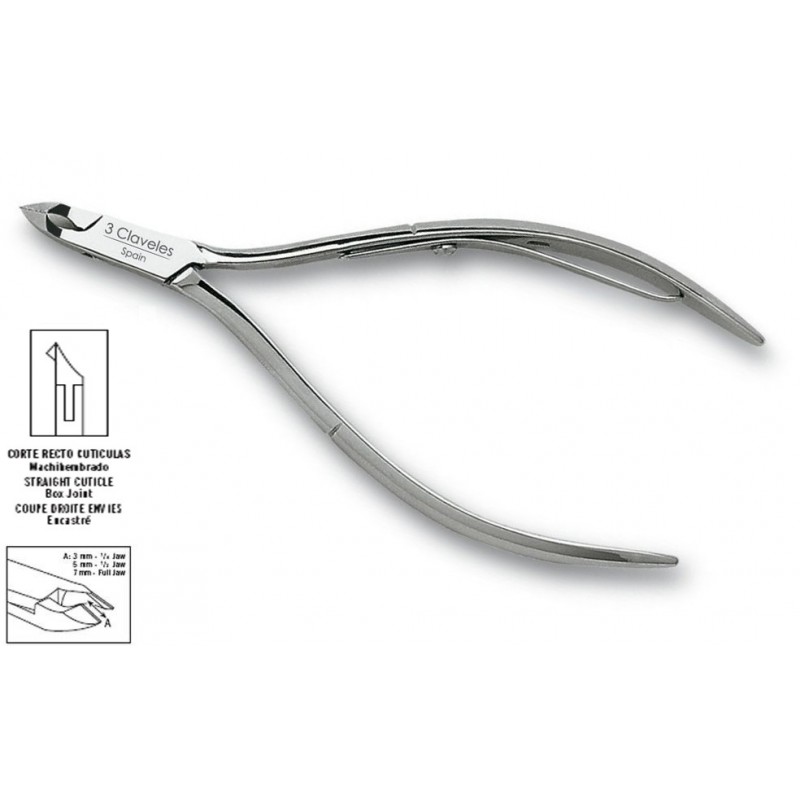 Alicates para cuticula y manicura 3 claveles. Alicates de calidad forjados en caliente y con acabados niquelados. Los alicates de manicura y cuticulas 3 claveles dispoenen de una superficie de corte de 3 y 5mm. Tal como se muestra en el siguiente esquema:
