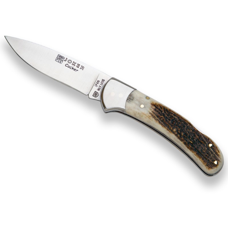 La navaja de bushcraft modelo Cocker NC47 fabricada en Albacete por Joker. La serie Cocker está fabricada en acero inoxidable MoVa 1.4116 con una hoja de 9 cm con bloqueo lockback y empuñadura de asta de ciervo con virola metálica