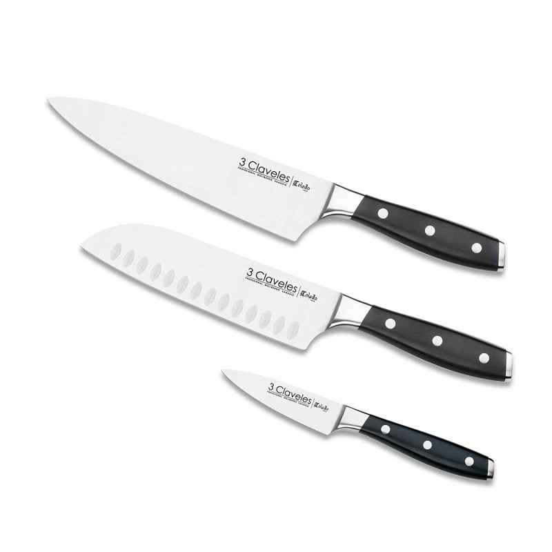 3 Claveles Set de Cuchillo de Cocina de la línea toledo para profesionales y amateurs. el set esta formado por un cuchillo de verduras de 9 cm: ideal para limpiar, pelar o cortar verduras y fruta. Un cuchillo de cocinero: hoja ancha y filo liso para todo tipo de carnes, vegetales, aves y pescados. Un cuchillo santoku: hoja ancha y extra afilada ideal para carne y pescado.
