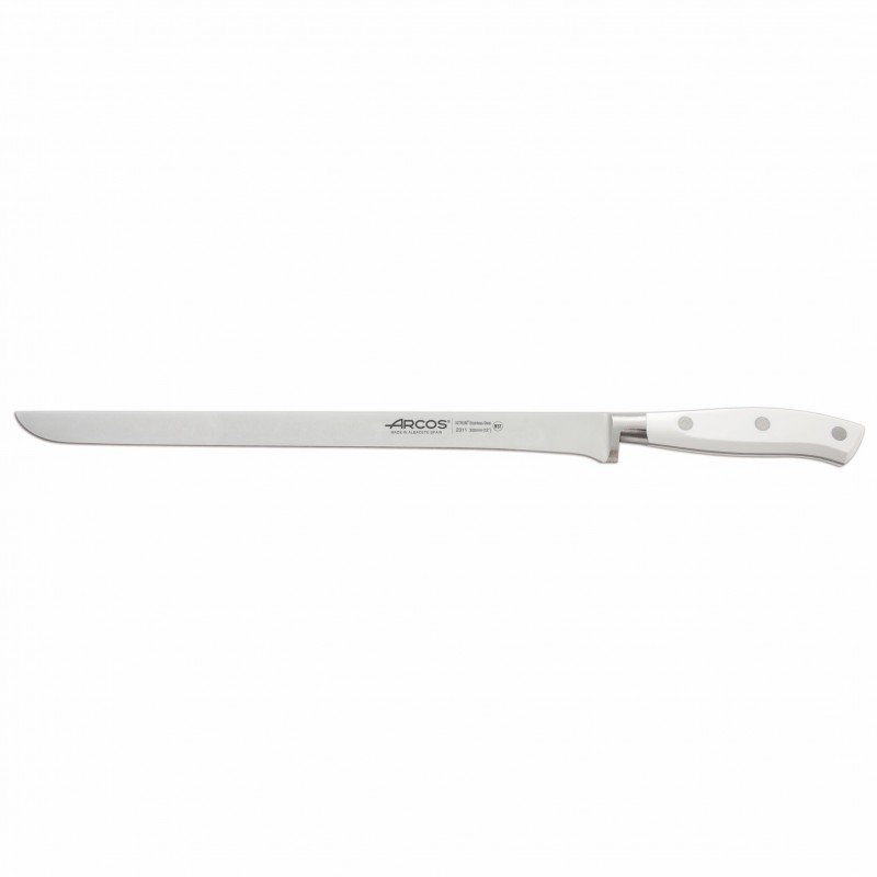 Arcos Riviera Blanc Cuchillo jamonero de 30 cm. Es un cuchillo para cortar jamón. Hoja hecha de acero inoxidable forjado NITRUM®, el exclusivo acero Arcos de alto rendimiento que garantiza una mayor durabilidad del filo.