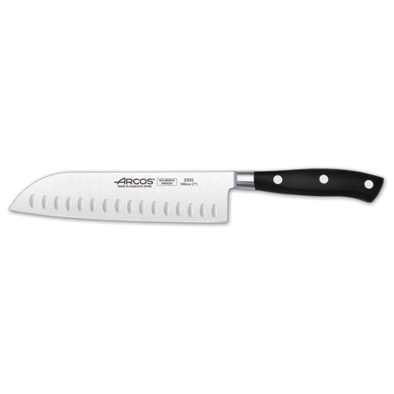 Arcos Riviera Cuchillo Santoku Alveolado 18 cm. Es un cuchillo para cortar verduras, carnes y pescados. Hoja hecha de acero inoxidable forjado NITRUM®, el exclusivo acero Arcos de alto rendimiento que garantiza una mayor durabilidad del filo.