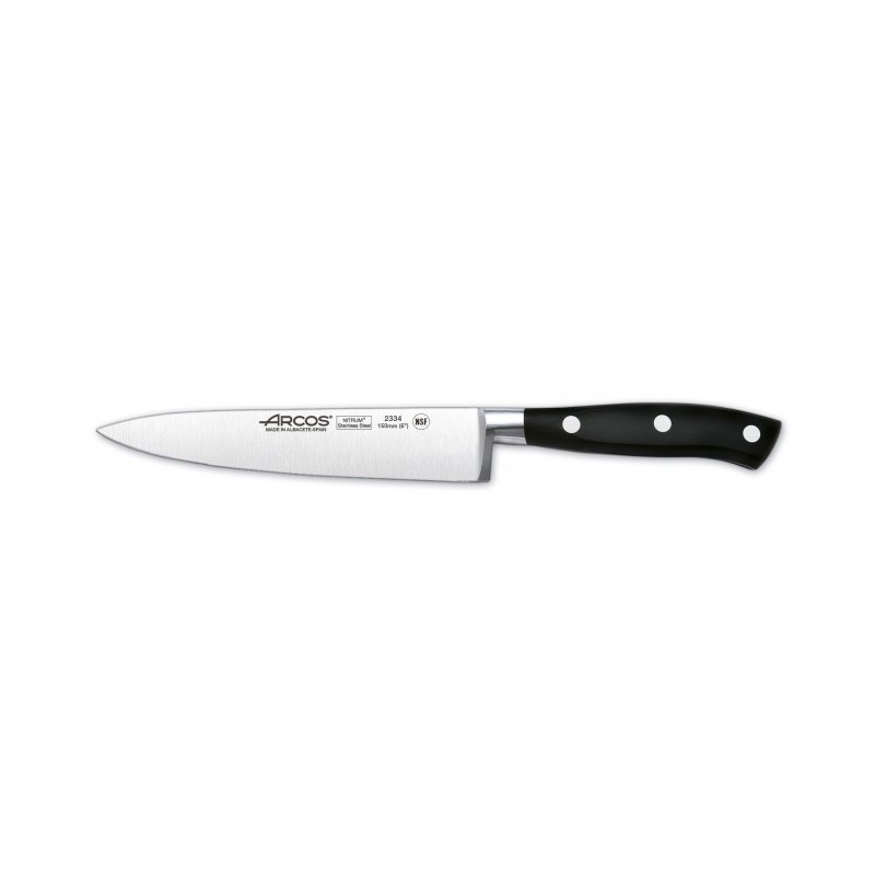 Arcos Riviera Cuchillo de cocinero 15 cm -5.9". Es un cuchillo para cortar verduras, carnes y pescados. Hoja hecha de acero inoxidable forjado NITRUM®, el exclusivo acero Arcos de alto rendimiento que garantiza una mayor durabilidad del filo.