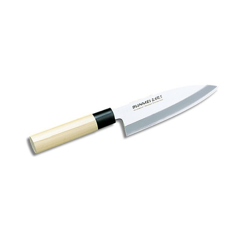 Bunmei 1805/135 Cuchillo japones Deba de 13.5 cms de hoja Bunmei, con un diseño típico de mango de madera, es perfecto para cortar, filetear y pelar todo tipo de pescados. Su hoja asimétrica es mejor para cortar y filetear el pescado en su parte delantera y para cortar espinas y pequeños huesos en su parte trasera.
