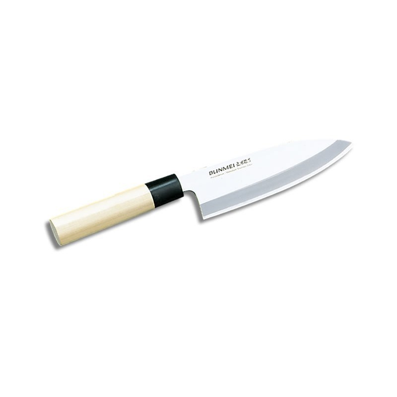 Bunmei 1801/195 Cuchillo japones Deba de 19.5 cms de hoja Bunmei, con un diseño típico de mango de madera, es perfecto para cortar, filetear y pelar todo tipo de pescados. Su hoja asimétrica es mejor para cortar y filetear el pescado en su parte delantera y para cortar espinas y pequeños huesos en su parte trasera.