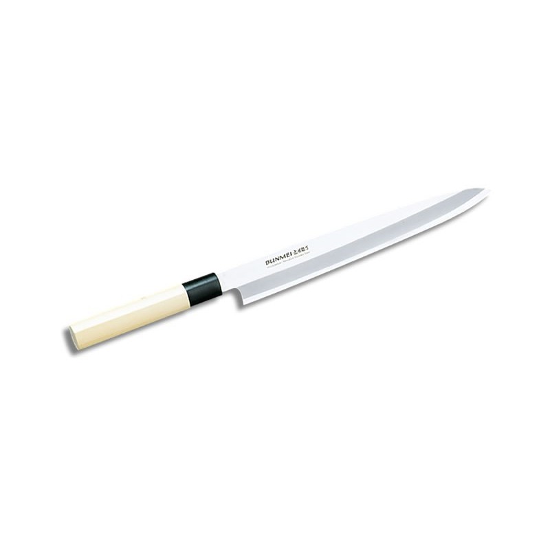 Bunmei 1804/270 Cuchillo tradicional japones Yanagiba de 27 cms de hoja Bunmei, con un diseño típico de mango de madera, es perfecto para cortar, filetear y pelar todo tipo de pescados. Especialmente diseñado para cortar pescado y carne en forma de filetes finos. Especial para sushi y sashimi.