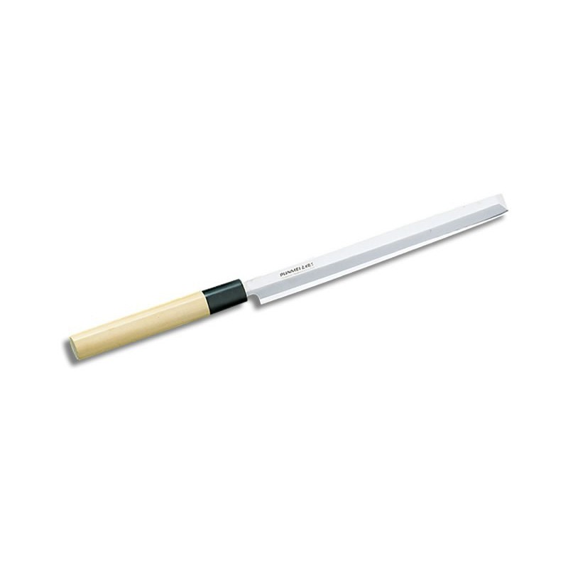 Bunmei 1803/210 Cuchillo Tako Sashimi de 21 cms de hoja, con un diseño típico de mango de madera de bambú, es un cuchillo perfecto para cortar pulpo, de ahi su nombre (Tako significa pulpo e japones). Especialmente diseñado para cortar y filetear todo tipo de alimentos.