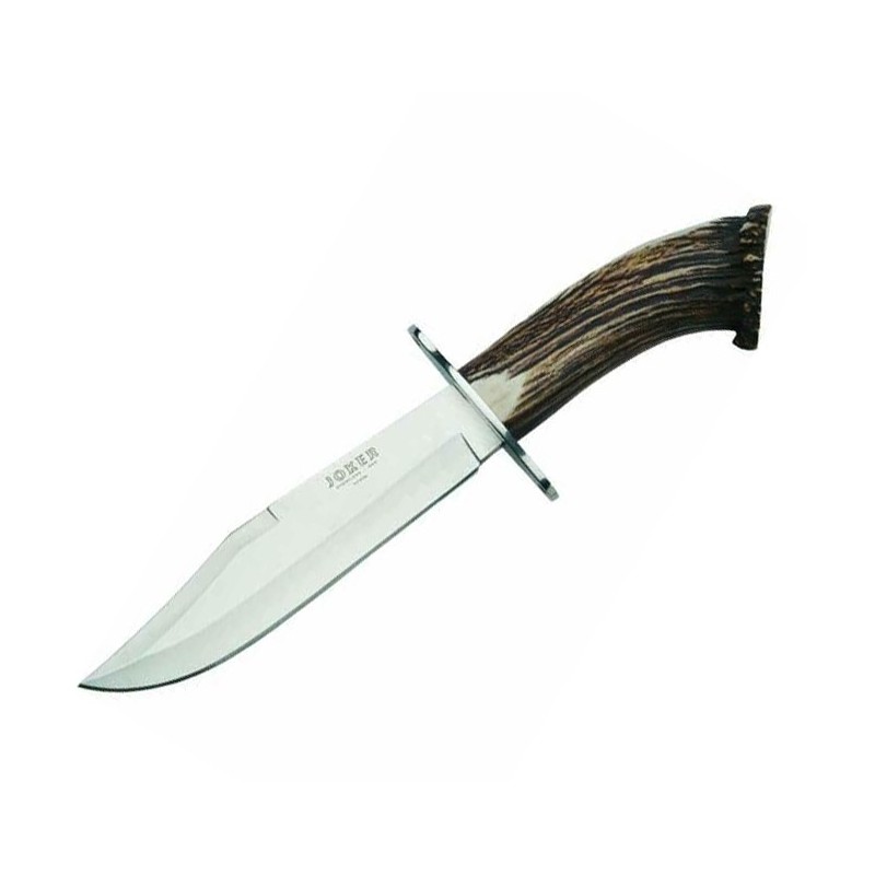 Joker CN101 Cuchillo de caza modelo Bowie con 25 cm de hoja y mando de asta de ciervo. Acero inoxidable 440, y su cruceta es de acero inoxidable y el puño es de asta de ciervo roseta natural. Los cuchillos joker contiene una funda de cuero para su transporte.