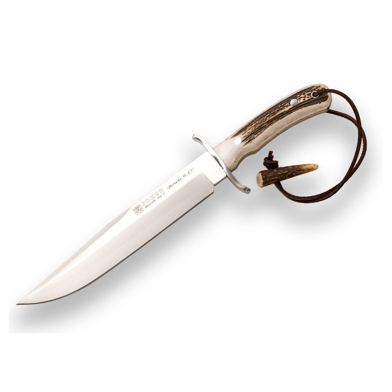 Joker CC139 Cuchillo de Caza Bowie, con una hoja de 24 cm en acero inoxidable Böhler N695 y un mango de 12,5 cm en asta de ciervo. Durabilidad, diseño clásico y funda de piel marrón de alta calidad. Ideal para cazadores y coleccionistas.