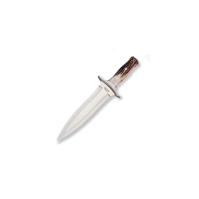 Cuchillo de remate enterizo - Joker - de la serie Coyote. Es un machete de caza con mango de ciervo y hoja de acero 440 inoxidable de 23,5cm y 460gr de peso. Este cuchillo incluye una funda de cuero.