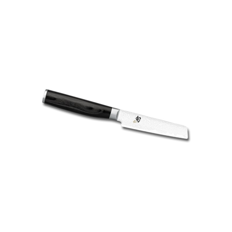 Kai TMM-0700 Tim Mälzer Minamo Cuchillo de Verduras 9 cm de hoja, núcleo extremadamente duro hecho con acero VG-MAX, envuelto en 32 capas de acero de Damasco. Mango de Madera de Pakka.