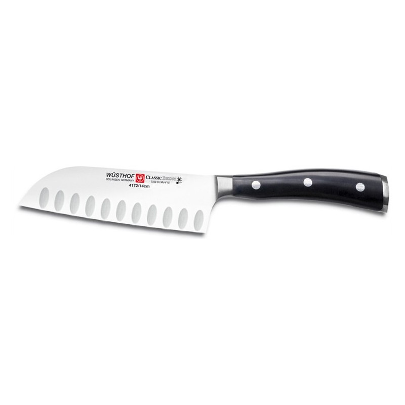 Cuchillo Santoku de cocinero Class Ikon Wüsthof de 14cms de longuitud de hoja Alveolado. Es un cuchillo para picar, así como para cortar carnes, pescados, frutas y verduras. Su mango es de material sintetico en color negro y ergonomico.