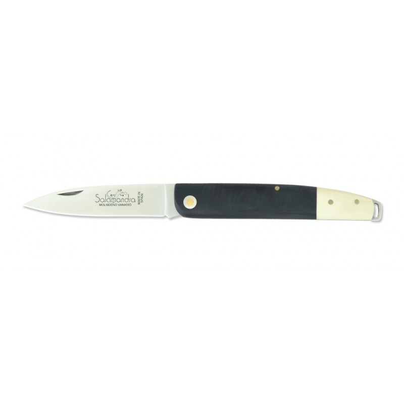 Navaja Salamandra 103251 (Albacete) de fabricación Española hechas a mano con hoja de acero inoxidable Molibdeno Vanadio. Empuñadura con forros en acero inoxidable con cachas de Juma combinado negro y blanco (el material Juma consiste en una mezcla de diferentes materiales de base mineral compuestas con un componente de resina).