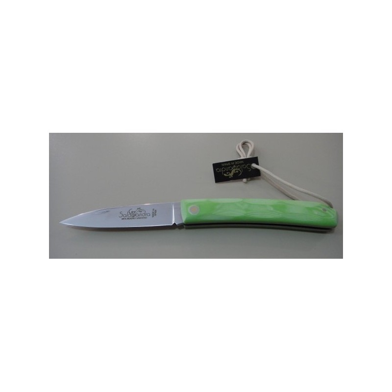 Navaja artesana Salamandra de fabricación Española con hoja de acero inoxidable Molibdeno Vanadio Mova y empuñadura de Mikarta color verde con detalles de acero inoxidable en el muelle. Tambien dispone de hueco con cordón. Sus sistema de ciere es de pistón.