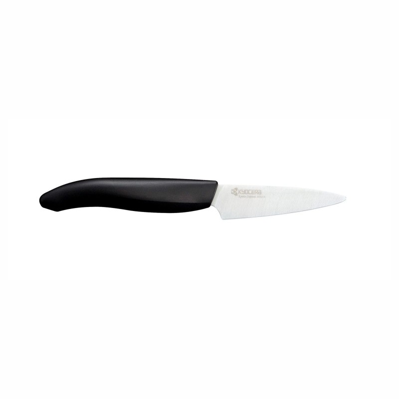 Kyocera FK-075WH Cuchillo Cerámico 75 mm de longitud de hoja. Su lamina es de oxido de zirconio, otorgandole una excelente durabilidad a su filo. Los cuchillos de cerámica Kyocera son resistentes y no pierden su capacidad de corte. El resultado es una hoja afilada que mantiene su filo hasta diez veces mas que un cuchillo de acero.