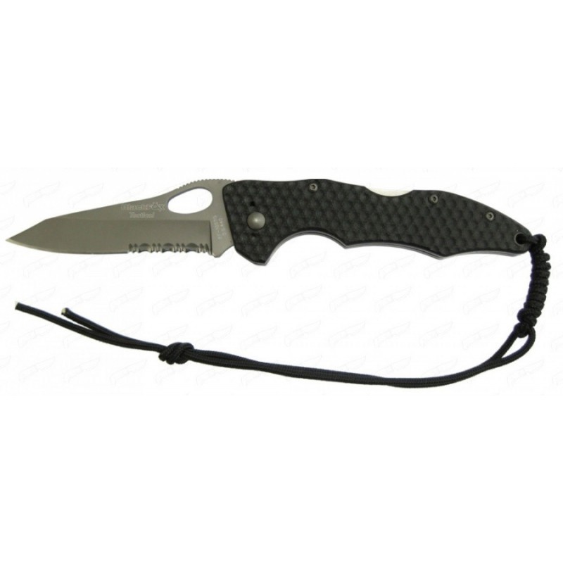 Navaja Táctica italiana BLACKFOX BF-105TIS. Su lamina es de acero inoxidable 440 con recubrimiento de titanio y filo semi serrado. Dispone orificio para facilitar su apertura con el dedo. La empuñadura esta formada por forros de acero y cachas de G-10, orificio para cordón, clip de enganche intercambiable para el cinturón y sistema de bloqueo "Lockback".
