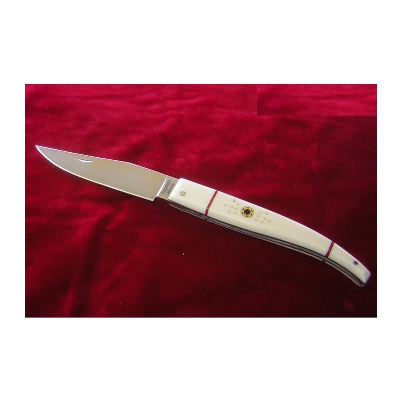 Navaja Artesanal Exposito hecha a mano,de tipo pistón con hoja de acero inoxidable con nucleo de VG-10 recubierto con acero damasquinado laminado. Su empuñadura es de marfil adornado con mosaico y claveteado en plata.. Dispone de muelle decorado y cierre de tipo pistón. Su hoja es de 8.5cms y su longitud total es de 19cms. Se presenta en un estuche de Madera. Coleccion Exposito