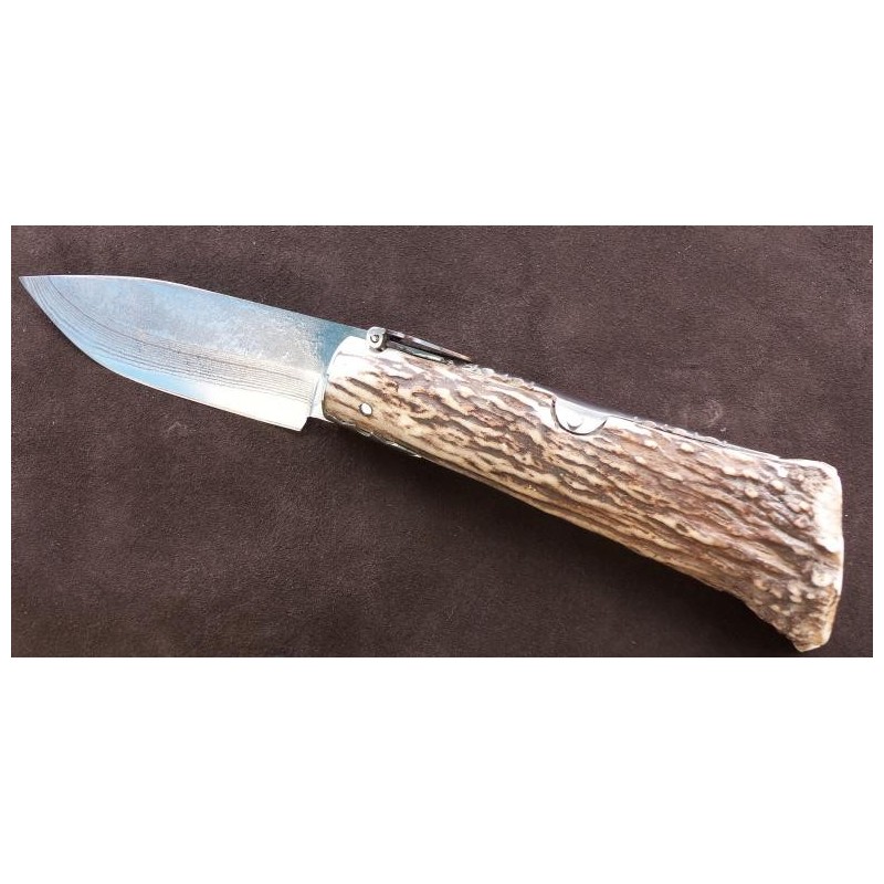 Navaja exclisiva Exposito de acero damasco y nuclero VG-10 con 10 cms de hoja y 22 cms de longitud total, fabricada con vareto de ciervo. Solo se Dispone de una unica pieza.