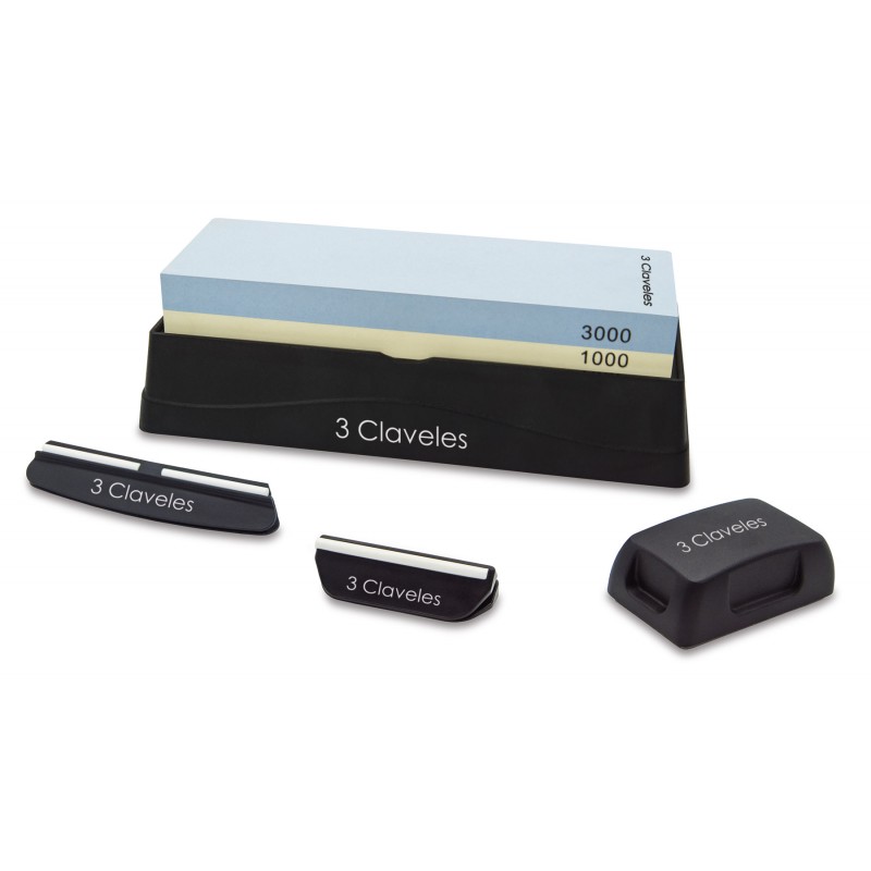 Piedra de afilar cuchillos de 3 Claveles de doble grano 1000/3000. Para el afilado y asentado del filo de sus cuchillos, incluye guía grande y pequeña así como rectificador para dejar la piedra lisa de nuevo.