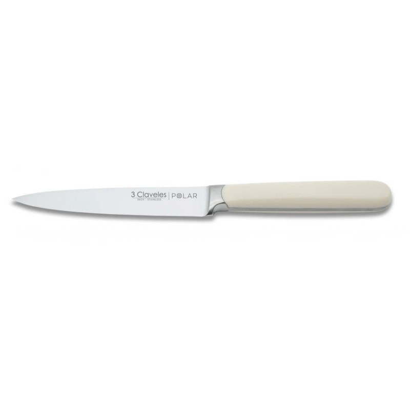 Elegante cuchillo pelador de la serie POLAR de 3 Claveles, forjado en acero 3Cr13, con virola y empuñadura de plástico ABS blanco. Apto para lavavajillas.