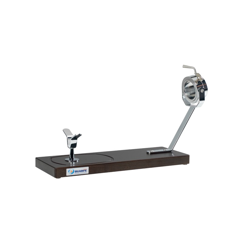 Elegante soporte jamonero profesional Buarfe con base en madera de haya de 1º calidad lacada en color tabaco. Los herrajes de acero con el acabado de la superficie en cromo brillo y pinchos de acero inoxidable. Con el sistema de casquillos giratorios se puede girar el jamón los grados que desee sin necesidad de soltar la parta del jamón.
