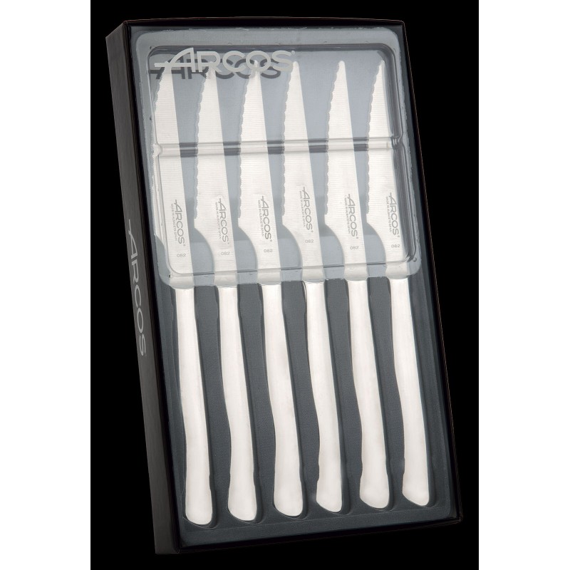 Set de 6 cuchillos chuleteros (375500) de la serie Monoblock de Arcos de acero inoxidable con filo perlado de 110 mm de hoja.