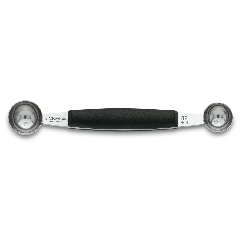 Vaciador de melón también llamado cuchara parisina doble, con diámetros de 22 y 25 mm en el modelo pequeño y de 22 y 30 mm en el modelo grande. Puede usarse para vaciar frutas, verduras patatas, mantequilla, etc Cada vaciador tiene un agujero en el centro para evitar que se produzca el vacío y sea sencillo extraer la bola. La longitud total es de 16,5 cm el modelo pequeño y 17 cm el grande.