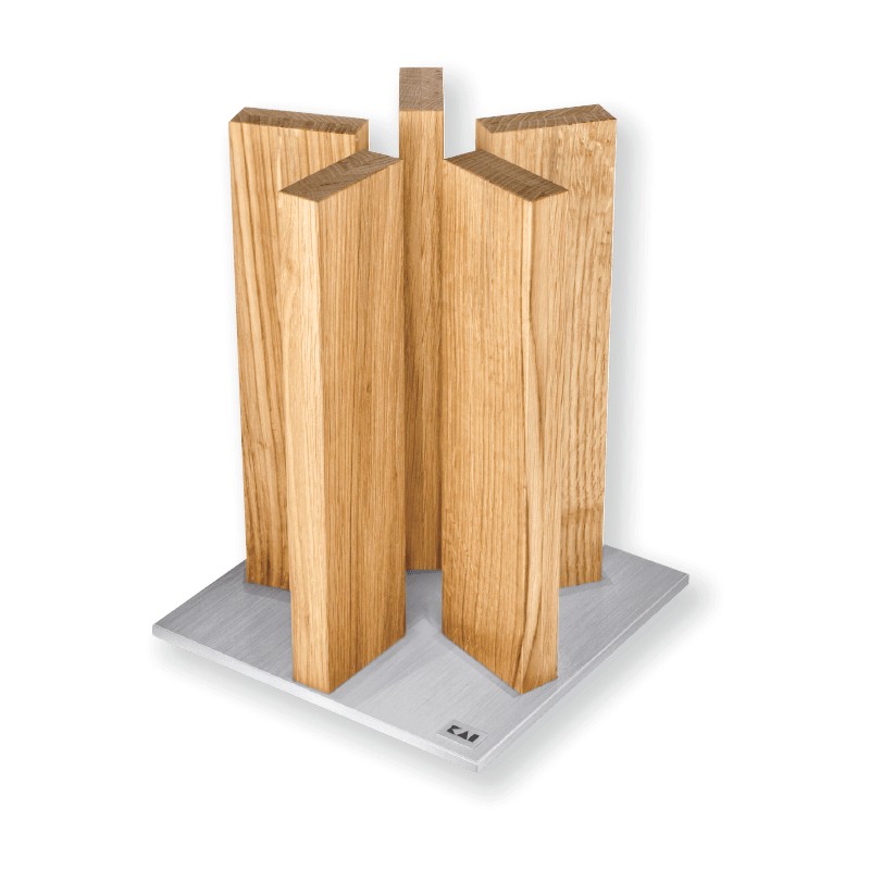 Matériaux de haute qualité : Blocs en bois de chêne et base en acier inoxydable, garantissant durabilité et résistance.