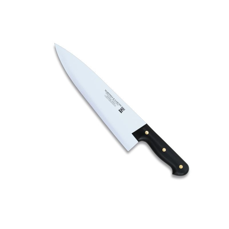 Couteau coup de poulet Mérida de Martínez y Gascón avec lame de 280 mm et épaisseur de 4 mm, avec manche en polyoxyméthylène noir. Avec rivets en laiton sur la poignée.