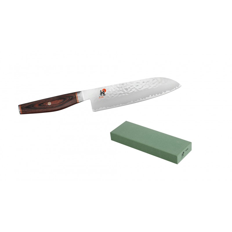 MIYABI 6000MCT Couteaux japonaiss Santoku 18 cm + Pierre aiguiser 400. Le couteau japonais de Miyabi est conçu pour trancher, trancher et éplucher les viande. Micro Carbide MC63, Tsuchime, lame en acier à poudre 3 plis. Manche en bois de cocobolo Pakka + acier inoxydable, ergonomique.