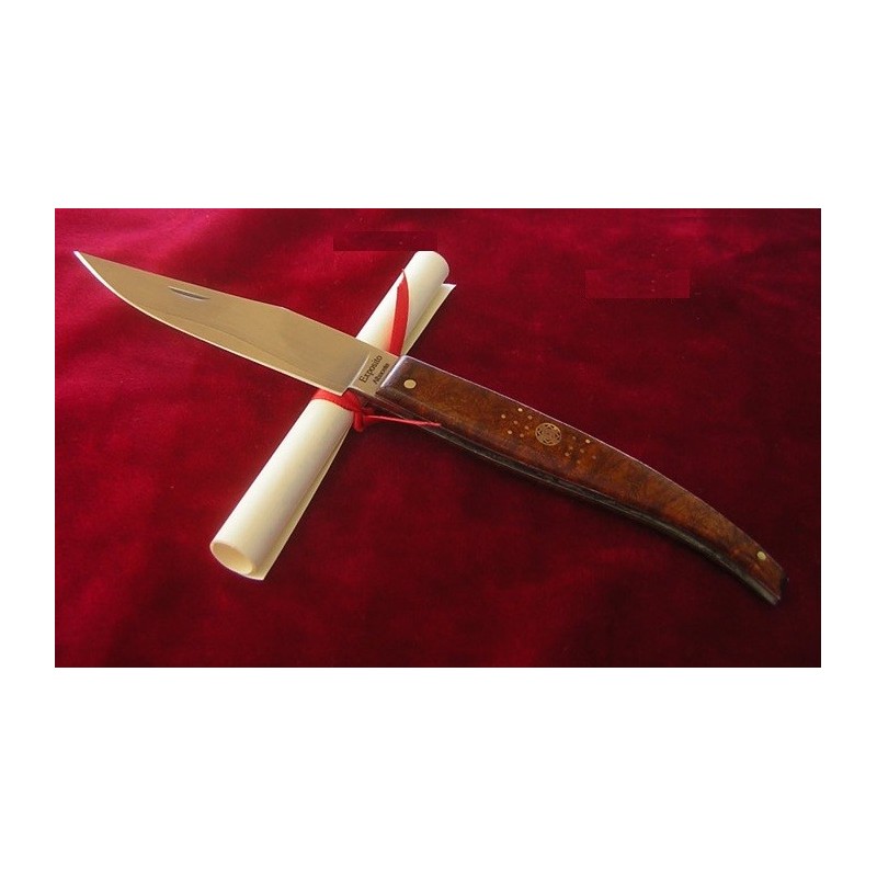 Couteau Exposito modèle Piston avoc corne de Désertiques du bois. Acier VG-10 (Damascu) pour 9cms. Orné sur le dos du couteau avec de la mosaïque. (Voir détails)