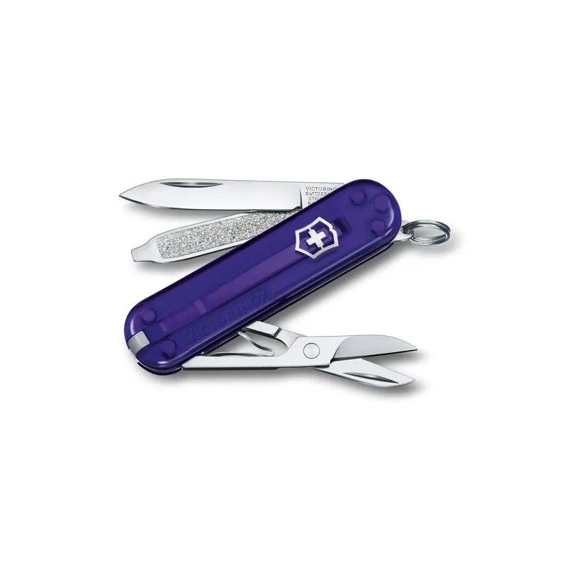 La Victorinox Classic SD - Persian Indigo allie élégance et praticité avec son design compact et délicat en violet translucide. Un outil multifonctionnel essentiel avec style !