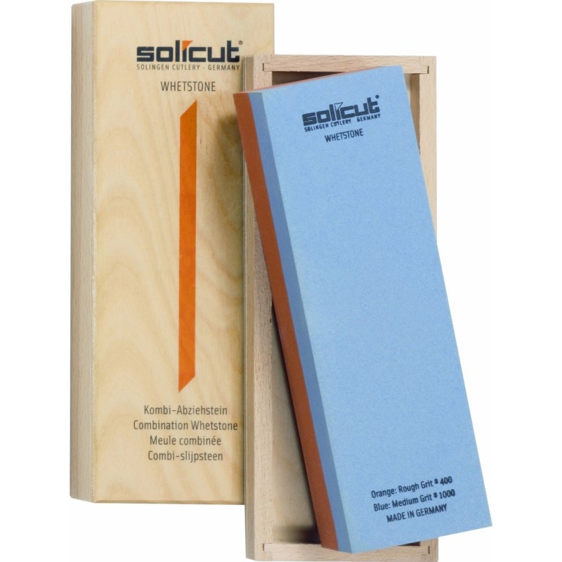 Une pierre combinée pour aiguisé des couteaux Solicut 400 / 1000 de Double visage, avec le granulé de 400gr par un visage pour réparer des lames abîmées (des mortaises, des ruptures, etc. ..) ou réaliser le premier aiguisé dans des lames qui ont perdu le fil complètement et 1000gr par l'inverse pour aiguisé des couteaux en général et pour asseoir le fil.