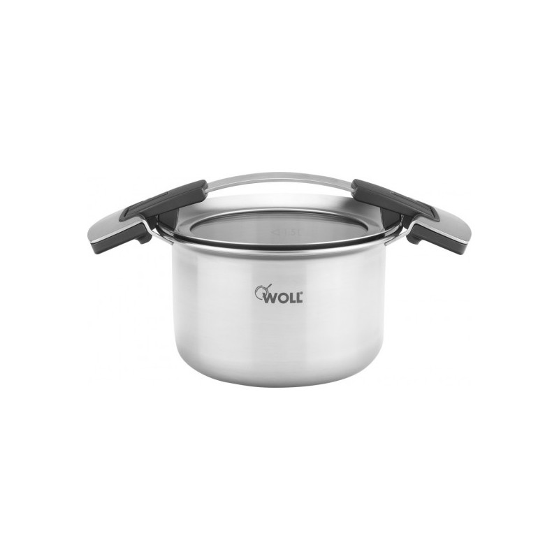 Woll Pote Concept Pro com 24 cm de diâmetro, feita de aço inoxidável e alumínio , com uma capacidade de 6 litros . Com Cobertura multifuncional com três posições. Um deleite para os cozinheiros a amantes do disenho.