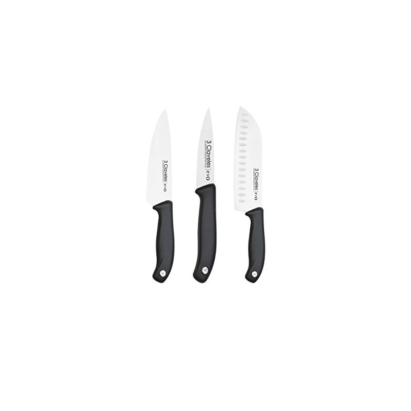 3 Claveles 99531 Conjunto de facas de cozinha da série EVO consistindo em uma faca de descascar de 10 cm, uma faca de chef 15 cm e uma faca Santoku de 18 cm. Um conjunto de cozinha múltiple.
