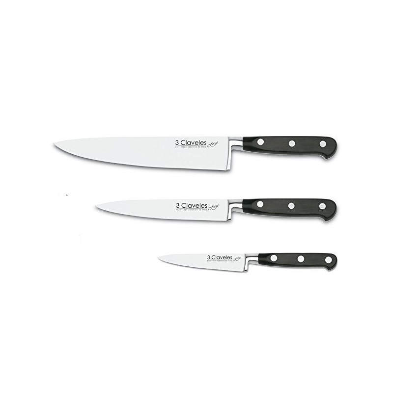 3 Claveles Conjunto de facas de cozinha profissionais, constituídas por uma faca de vegetais, 10 cm, uma faca de cozinha de 15 cm e uma faca de cozinha de 20 cm.