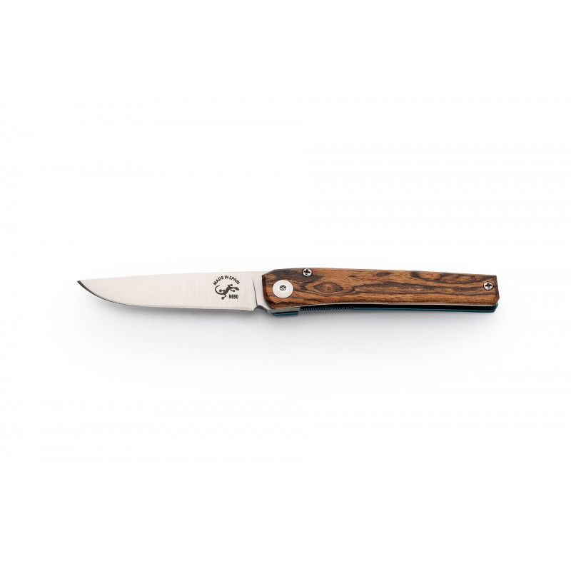 Canivete Salamandra Série S-310 com cabo único de Madeira de Bocote e trava interna. Fabricado em aço inoxidável Böhler N690 com espessura de 2,7 mm e comprimento da lâmina de 70 mm, com comprimento total de 160 mm e peso de 40 gramas.