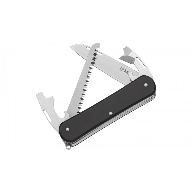 Canivete Multiuso Fox VULPIS. Projetado pela FOX e fabricado com os mais altos padrões de qualidade. Cabo de titânio com acabamento jateado, ferramentas em aço inoxidável BÖHLER M390. Inclui lâmina de faca, serra para madeira, abridor de latas, abridor de garrafas e chaves de fenda.